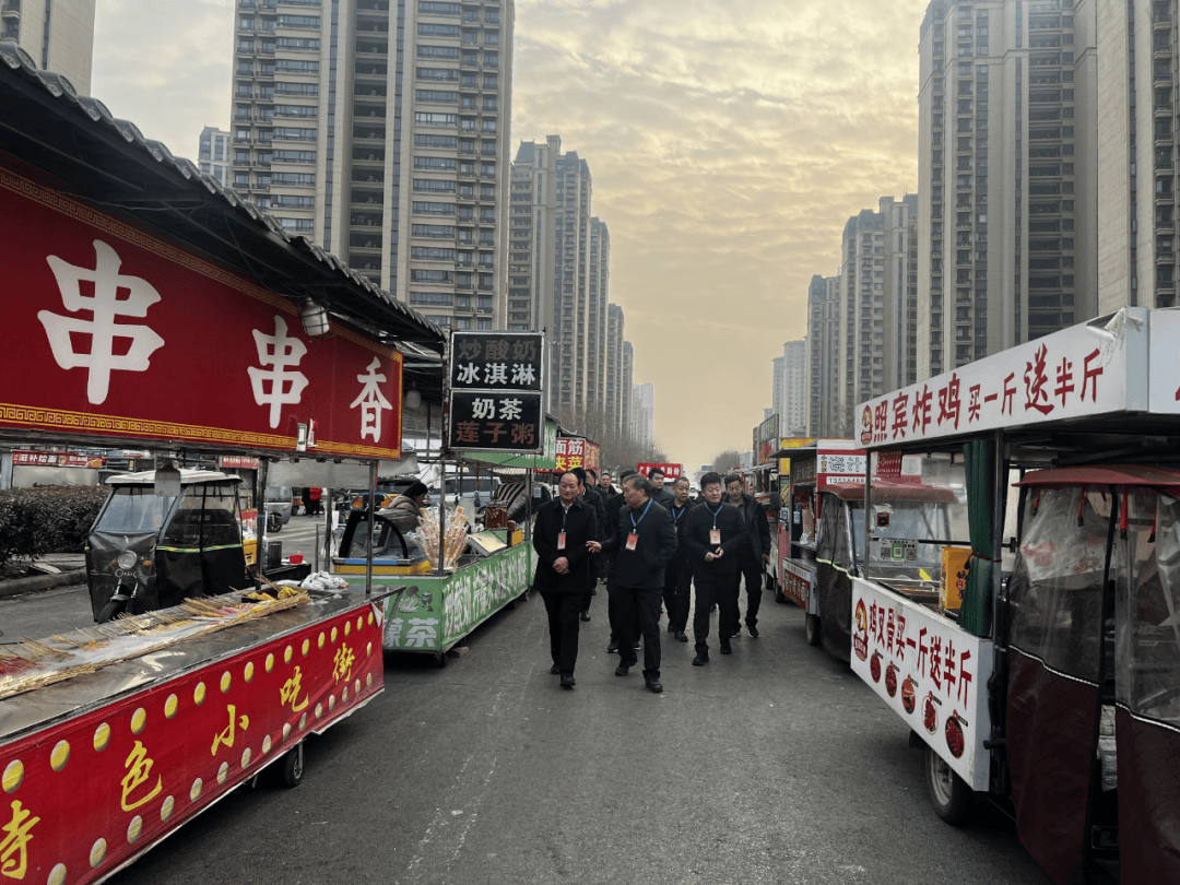 调研组先后到恒大御景湾夜市点、金碧全国夜市点、碧桂园凤凰湾夜市点、凤湖美食广场夜市点、省医夜市点、平原小区廉租房夜市点、闫庄村夜市点,细致查看摊位结构、卫生、食物平安及周边道平安泊车等环境,取摊从面临面交换,扣问运营收益、证照打点、成本承担等现实问题,倾听商户对规范运营、配套保障的。